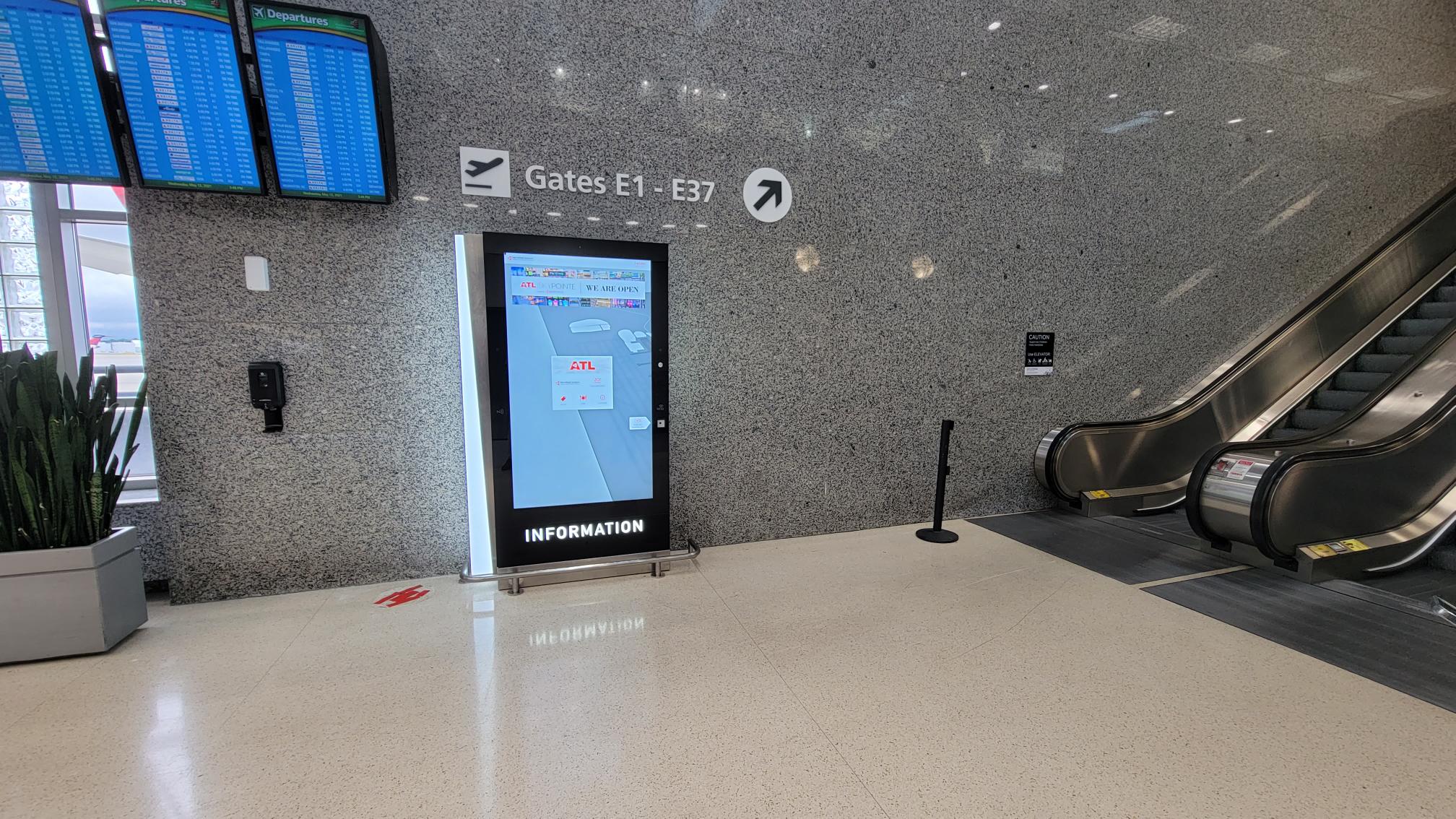 - An airport terminal features digital signage with a map, guiding travelers to Gates E1 – E37. Kiosks line the path, and an escalator stands on the right. A flight information display board hovers in the upper left corner.
