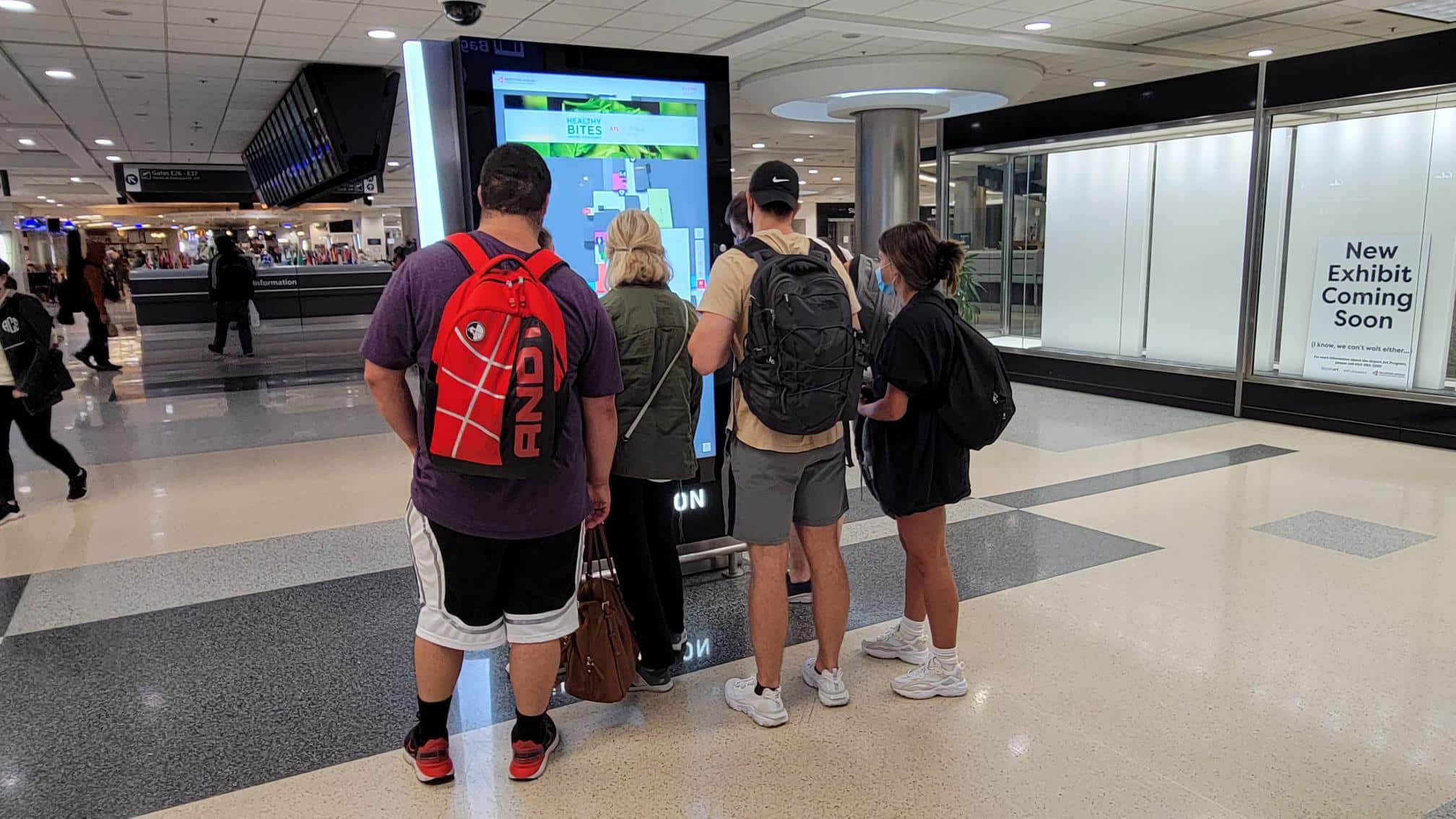 - Four people stand in an airport terminal, gazing at a digital signage directory. They wear casual clothing and backpacks. The area is spacious with a polished floor and overhead lighting. A nearby sign announces a new exhibit coming soon.