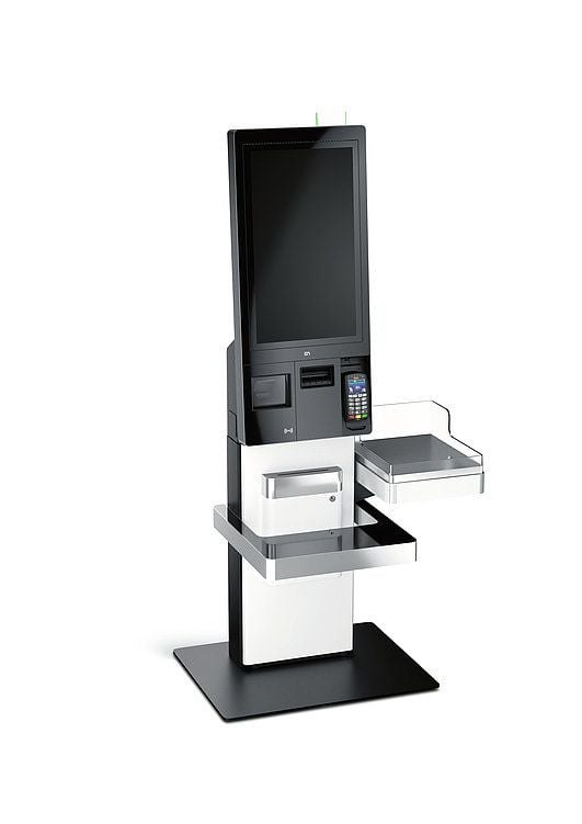 - A modern self-service kiosk with digital signage features, including a large touchscreen, payment terminal, and two metal shelves for customer checkout, set against a white background.