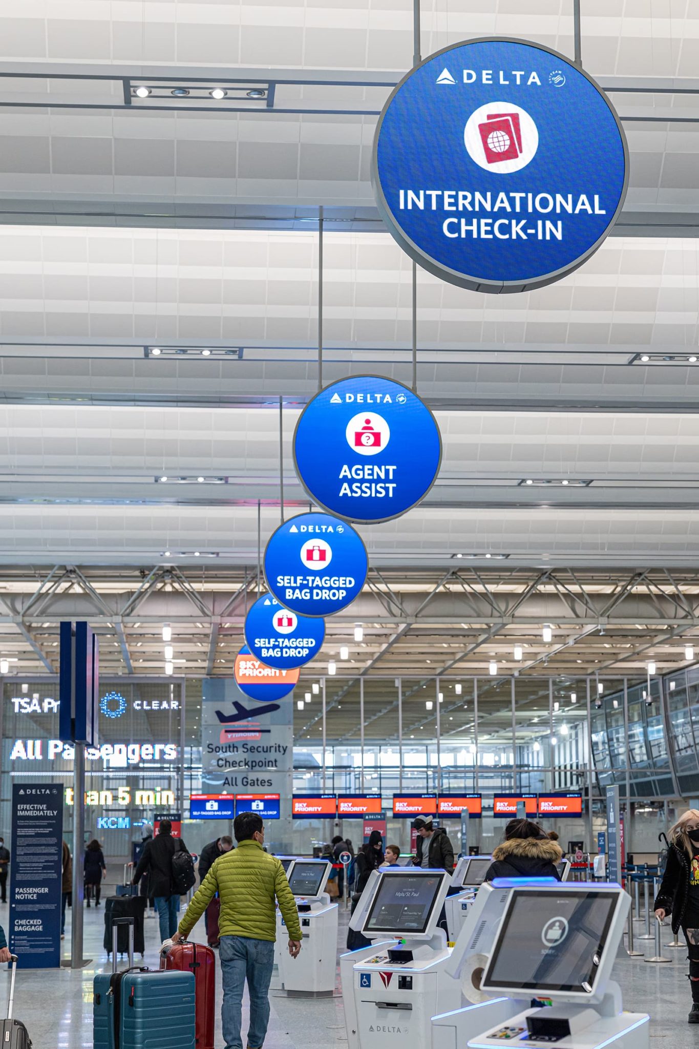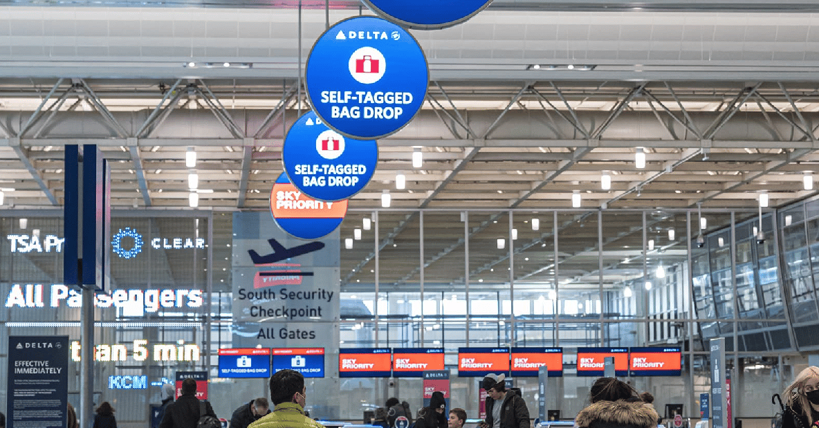 - The airport terminal features blue and red signs for Deltas self-tagged bag drop and Sky Priority. Passengers queue under modern bright lighting, while TSA and CLEAR signage is visible. Digital signage enhances the area’s efficiency, guiding travelers to multiple check-in counters.