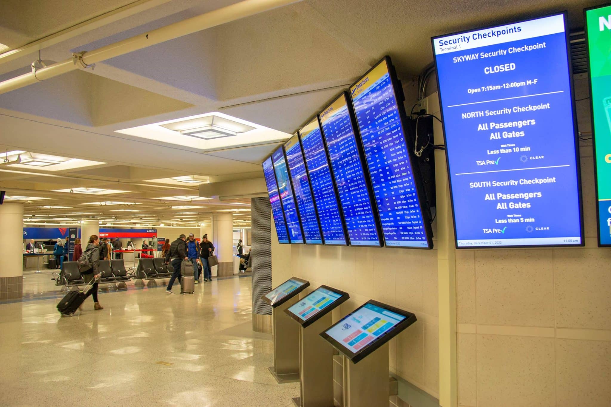 - A busy airport terminal buzzes with travelers, their luggage in tow. Above, a row of digital signage screens updates flight and security information, casting a glow on kiosks below. Ceiling lights shine brightly over the bustling scene.