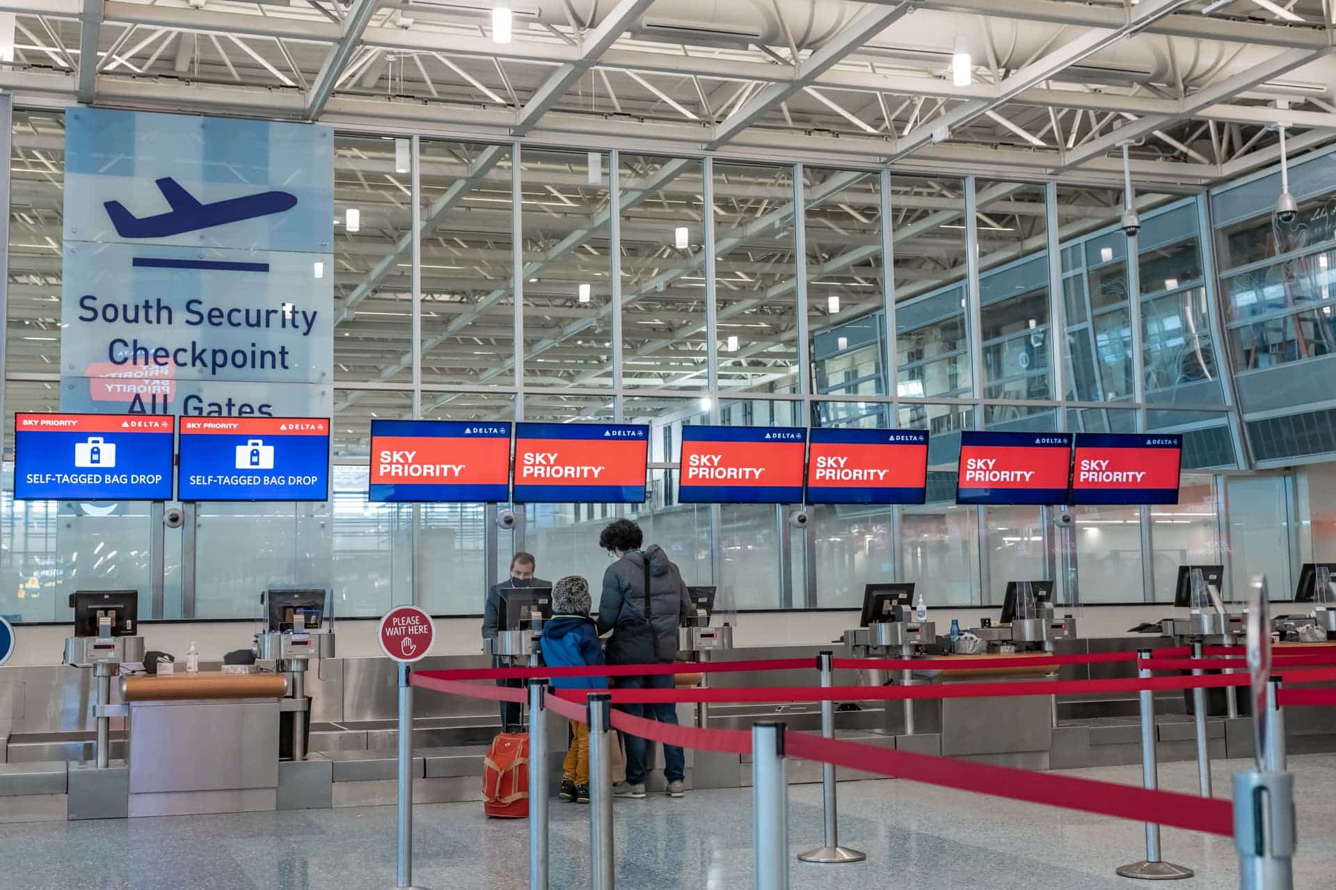 - A family stands at an airport check-in counter, surrounded by digital screens displaying Self-Tagged Bag Drop and Sky Priority. The area is empty, bordered by red ropes, with airport digital signage highlighting the South Security Checkpoint overhead.