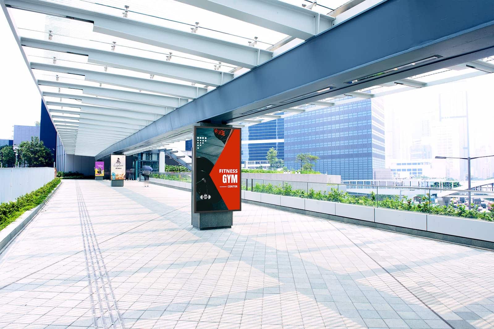 - A modern, open-air covered walkway with tiled flooring leads through an urban area. A digital kiosk, a recent winner of digital signage awards, displays an ad for a fitness gym. Green plants line the walkway on the left, and tall buildings are visible in the sunny background.