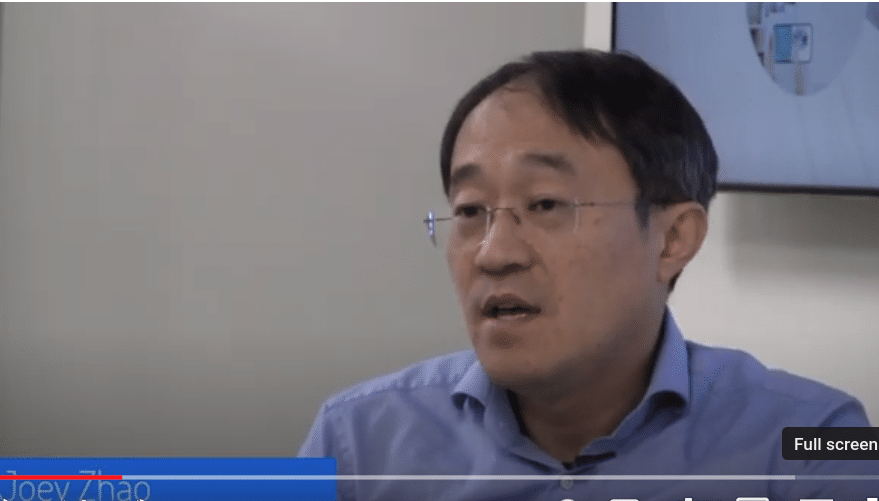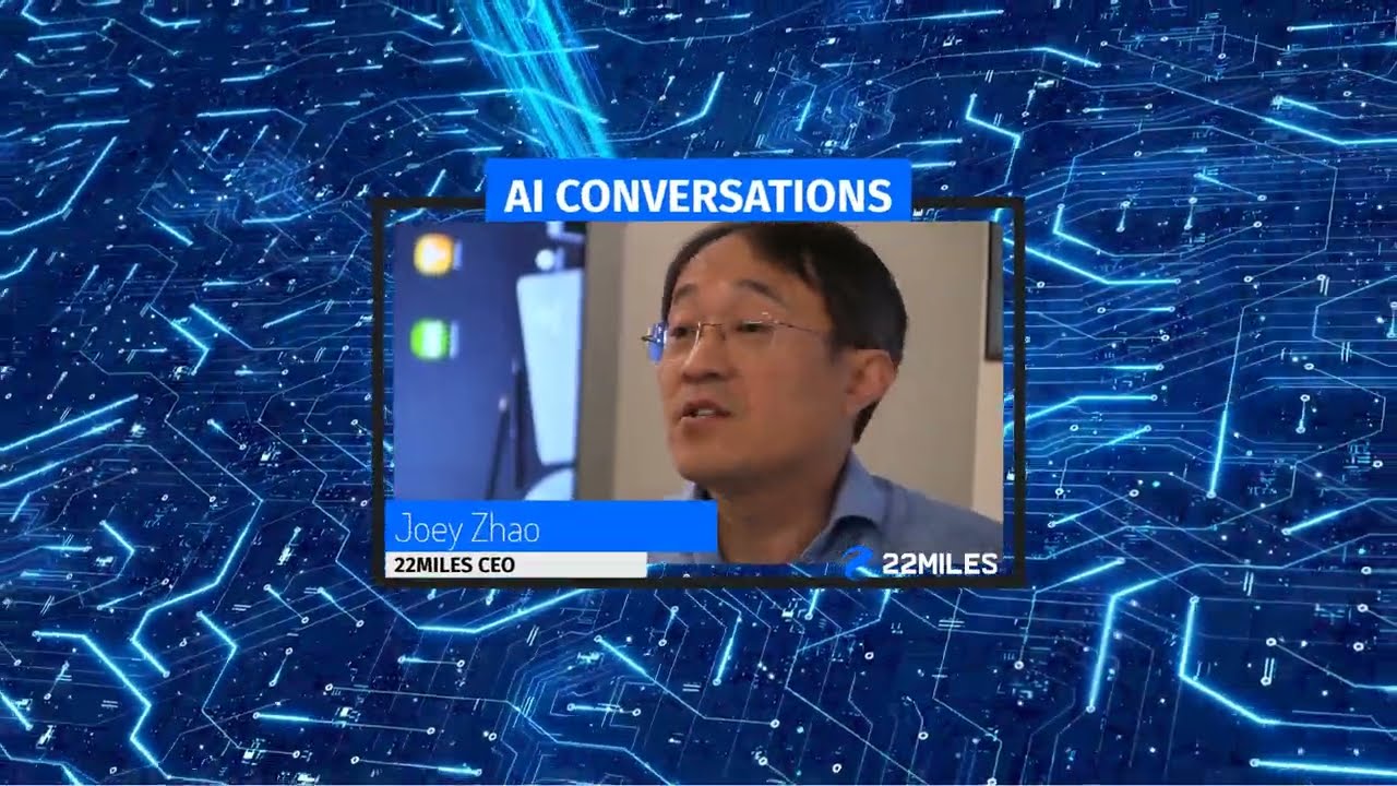 - Framed image titled AI Conversations featuring a person speaking, labeled Joey Zhao, 22Miles CEO, against a backdrop of digital signage AI. The background showcases a digital circuit design with interconnected blue lines and a central glowing light.