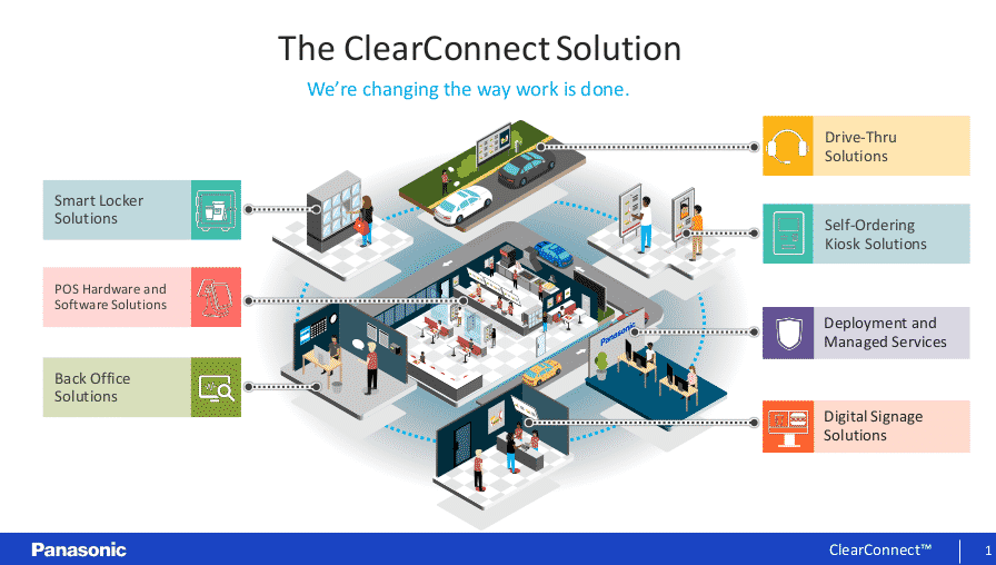 - Diagram titled The ClearConnect Solution showcasing interconnected services: Smart Locker Solutions, Back Office Solutions, POS Hardware and Software Solutions, Self-Ordering Kiosk and Digital Signage Solutions, Drive-Thru Solutions, Deployment and Managed Services.
