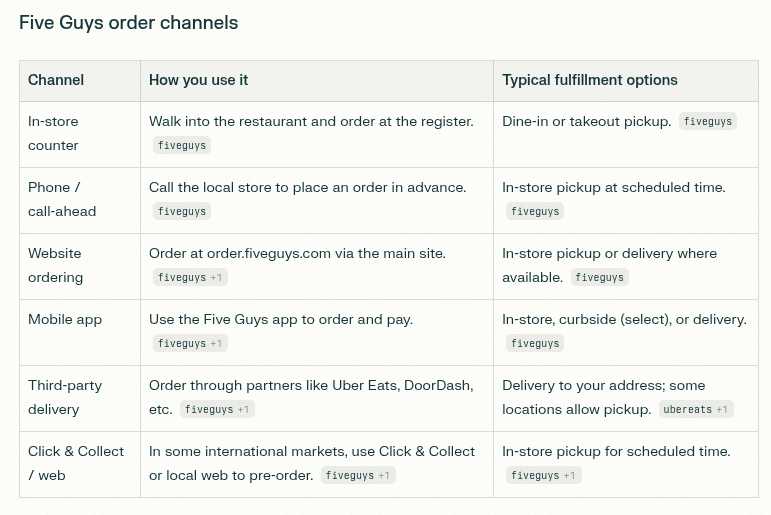 - Five Guys focuses much more on online and mobile ordering (via Olo and earlier GoMobo partnerships) than on in‑store self‑order kiosks. https://www.retaildive.com/ex/mobilecommercedaily/five-guys-taps-gomobo-to-launch-mobile-ordering-system
