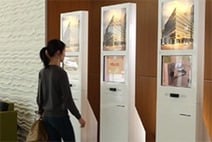 - A person stands in front of a row of touch-screen kiosks mounted on a wall. The kiosks have images and text displayed on them. The surrounding area has a modern interior design with textured walls.