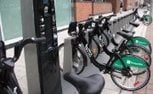 - Row of rental bicycles with green wheel covers at a bike-sharing station, neatly aligned along the city sidewalk. A better kiosk for bike rentals stands conveniently on the left, with buildings rising in the background.
