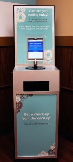 - A screening tablet kiosk in Philadelphia, with a touchscreen display, greets you with How are you feeling today? It encourages a health check-up from the neck up, promoting mental health awareness. The design features gear graphics on a blue background.