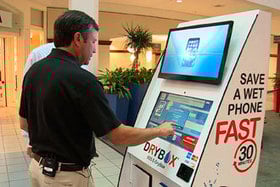 - A person interacts with a self-serve DryBox kiosk in a shopping center. The screen displays instructions, while a sign reads Save a Wet Phone Fast. This innovative station is designed to dry your wet smartphone in just 30 minutes.