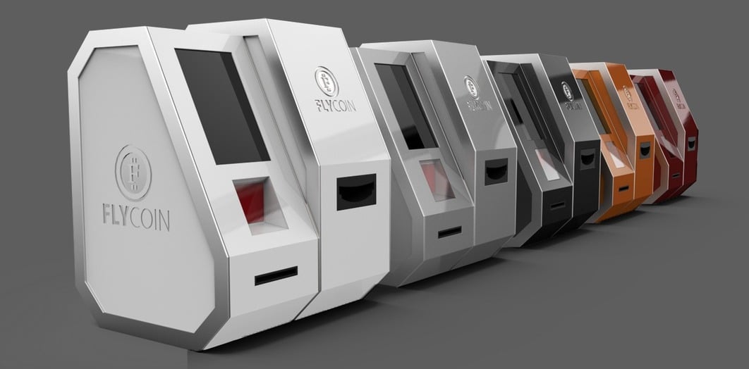 - A row of futuristic Bitcoin ATMs in vibrant hues—white, gray, orange, and red—each bearing the FlyCoin label. These digital money marvels are angled to reveal their display screens and card slots at the front.