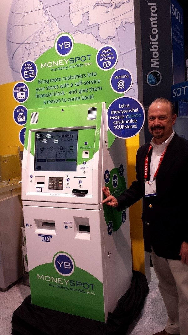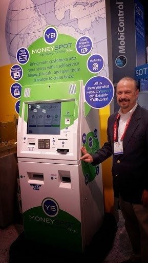 - A man stands beside a green and white MONEY SPOT financial kiosk, which also serves as a Verizon Bill Pay Kiosk. It has a screen and various buttons, while the background features informational signage about the product.