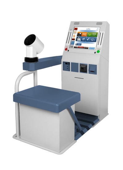 - A Stayhealthy blood pressure kiosk features a blue seat and white console with a screen, buttons, and an arm cuff. This self-service machine offers convenient health checks, including blood pressure measurements, as part of Higis innovative kiosk consolidation approach.