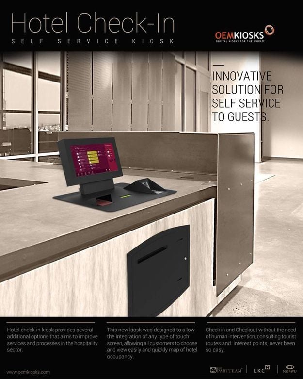 - A hotel self-service kiosk, a shining example of hospitality improvement, sits on the counter with its touchscreen interface enabling guest check-ins. The poster promotes it as an innovative solution for enhancing efficiency and streamlining check-in without requiring staff assistance.