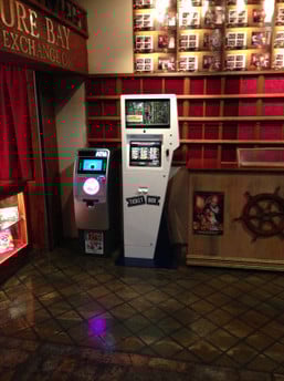 - A dimly lit room in Orlando features a white ticket vending machine next to an ATM. The walls, adorned with wooden shelves and a pirate ship steering wheel decoration, create a nautical vibe. On the left, a display case brims with photos or memorabilia from past journeys.