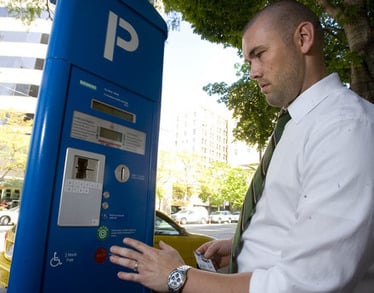 - A man in a white shirt and green tie inserts money into a blue parking meter on a sunny street lined with trees and buildings.