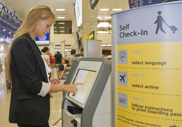 - A woman uses a self-service check-in kiosk at Malta Airport. A sign next to her outlines the steps: select language, select airline, and print a boarding pass. People and the airports signage bustle in the background.