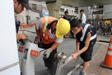 - Workers in safety vests and helmets are installing or repairing a turnstile barrier on a New Taipei street. Focused on the mechanism, one wears a yellow helmet while another dons a black vest. Orange traffic cones and YouBike rentals are in the background, adding to the urban scene.