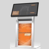- A digital kiosk with a large screen on top, displaying text and graphics. Below the screen, theres an orange and white panel with abstract designs and lettering, held by a metallic stand against a plain background.