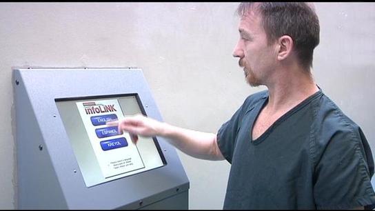 - A man in scrubs uses a touchscreen kiosk labeled Trouble, Request, and Special at the new infoLINK kiosk installation outside of Yakima County Jail. The kiosk, positioned against a plain wall, offers streamlined access to crucial services.