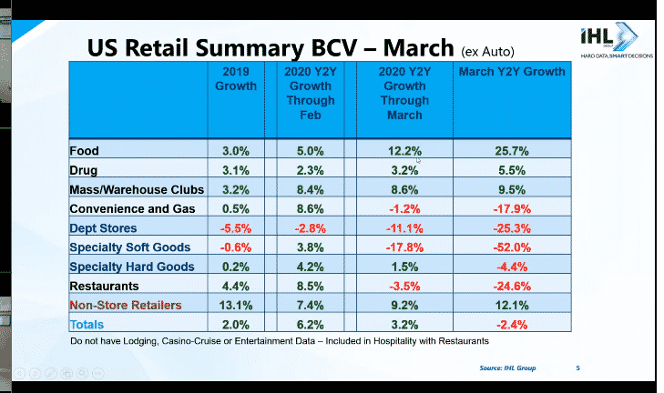 - Chart titled US Retail Summary BCV – March (ex Auto) by IHL highlights growth percentages for various retail sectors in 2019 and 2020, detailing growth through February and March. Categories like Food, Drug, and Restaurants are shown with insights on COVID-19 impact on small business growth.