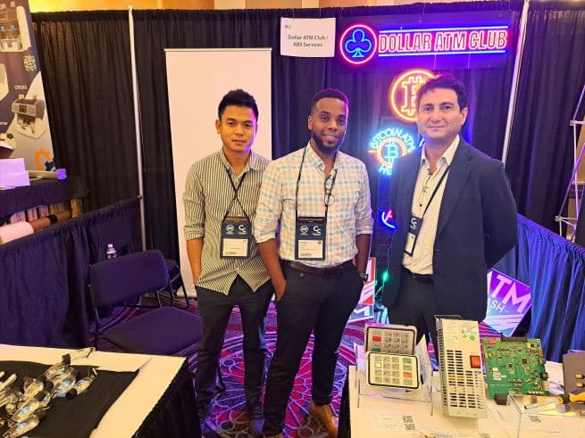 - Hau Nguyen and Fareed Alabasi of Aguila Business Service join Ed Dedelioglu of Dollar ATM Club at their combined exhibit.