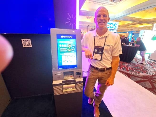 - Jeremy Ward presents the Hyosung Pay interface at the Hyosung exhibit.