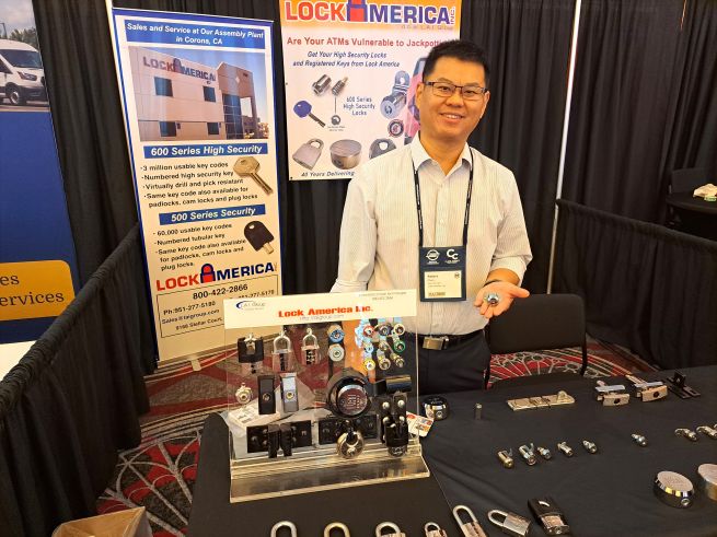 - Robert Chen presents a lock for the Genmega Universal Kiosk at the Lock America International exhibit.