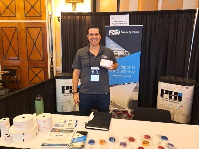 Paper Systems Inc., a provider of paper rolls for ATMs and other industries, presented various size paper rolls, along with POS ribbons, ink jet cartridges, thermal transfer ribbons and printed rolls and labels. The company can custom print as many as six colors.
