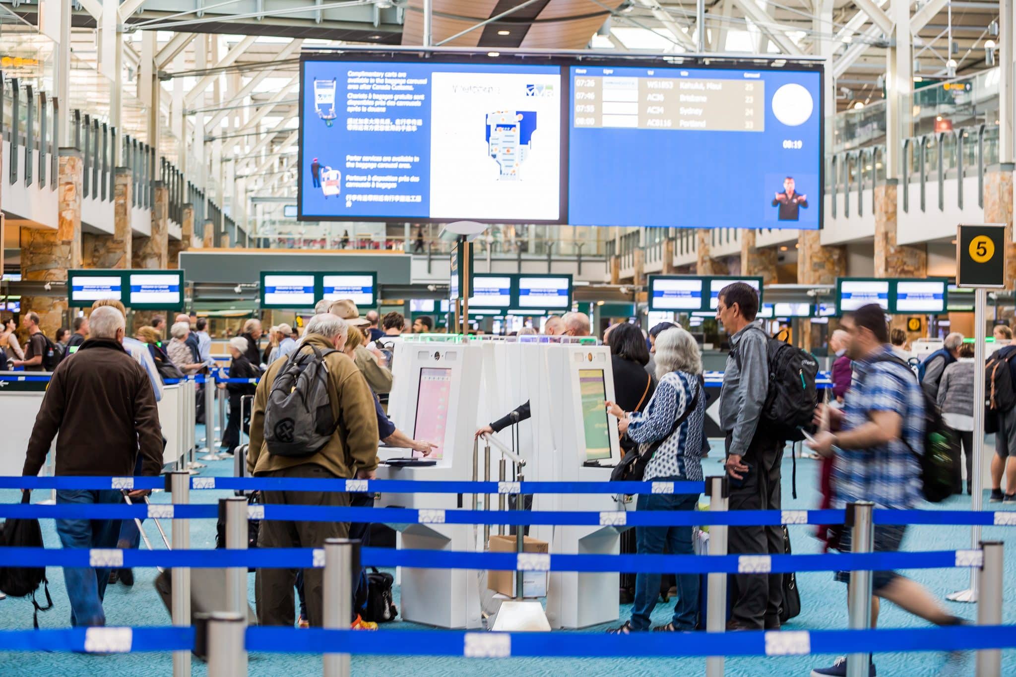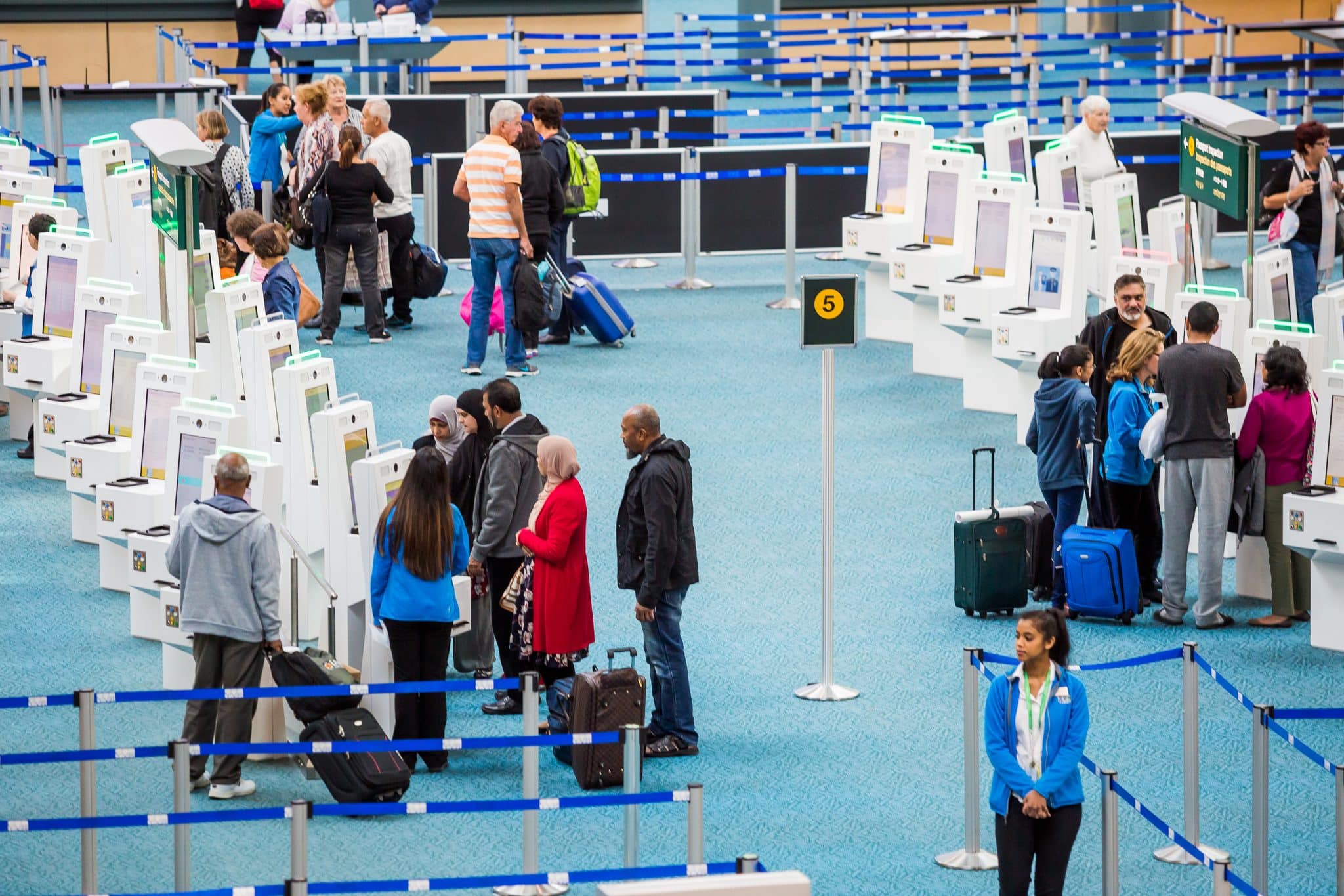 - A bustling airport terminal features travelers at self-service and border kiosks for check-in. Passengers with luggage queue in roped-off lines, while an airport staff member in a blue jacket offers assistance. The space is adorned with blue carpeting and directional signs.