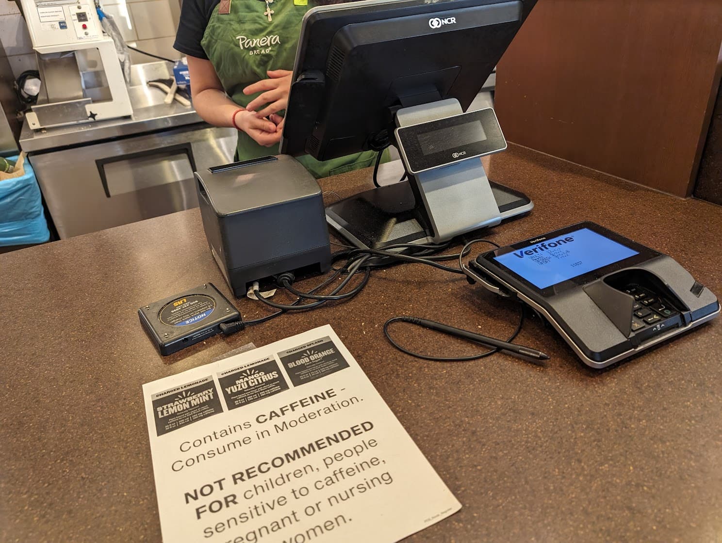 - A Panera Kiosk at the counter displays a tempting sandwich with a Tap to Order prompt. A sign warns about caffeine consumption, advising moderation and not recommending it for children, sensitive individuals, or pregnant and nursing women.