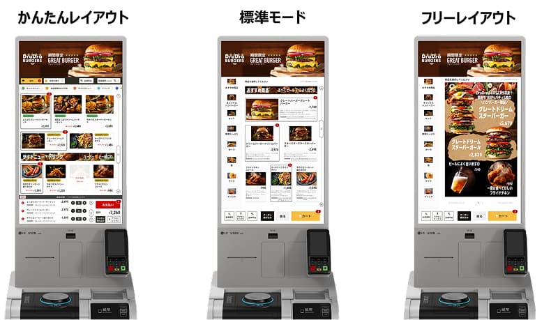 より短時間での注文を重視した「かんたんレイアウト」、客単価向上を重視した「標準モード」、店舗デザインを自由に反映できる「フリーレイアウト」の3つのデザインモードを搭載。店舗運営の方針や業態に合わせて、柔軟にカスタマイズ可能。