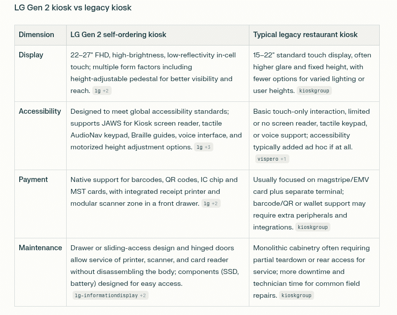 Restaurant and retail operators should care because LG’s Japan/Korea kiosks show where global self-order tech is heading: accessibility-by-design hardware (height-adjustable, screen reader, tactile, and voice) that can serve more customers independently and reduce staff burden. They also signal that major brands and regulators are treating inclusive kiosks as a strategic standard, not a niche upgrade, which will influence expectations and competitive benchmarks in other markets.