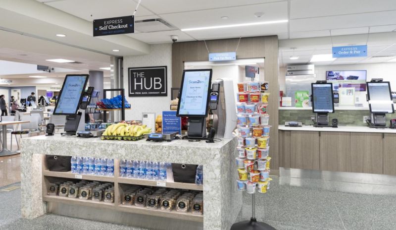 - Modern cafeteria with POS kiosks labeled The HUB. The counter displays bananas, water bottles, and packaged coffee. A stand offers various snack containers. Signs indicate express self-checkout and order & pay areas.