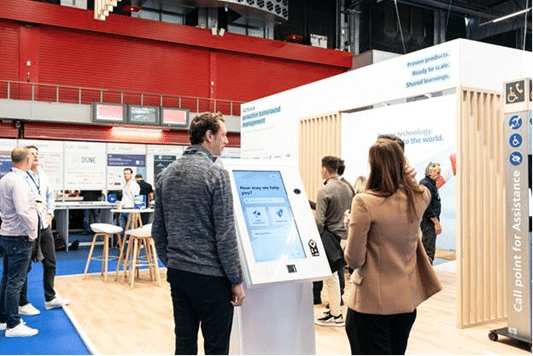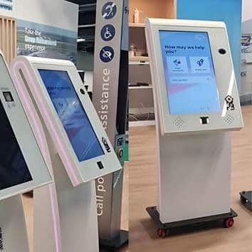 - Two touchscreen kiosks, winners of the prestigious Prestop Kiosk Award, stand on a wooden floor with screens displaying assistance services. The kiosks boast sleek white designs, complemented by additional pictogram signage visible in the background.