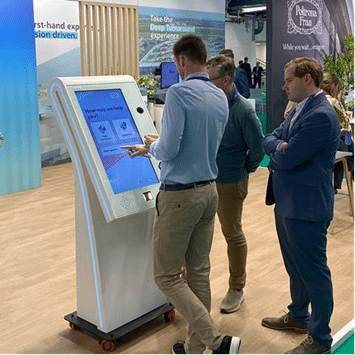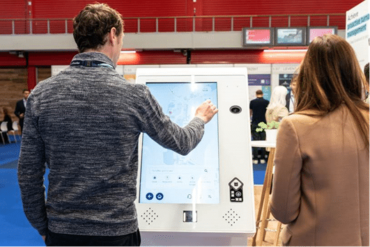 - A man and a woman stand at a large touchscreen kiosk in an indoor setting. The Prestop kiosk, renowned for its award-winning design, displays various icons as the man interacts with the screen. In the background, other people and red partitioned walls are visible.