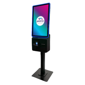 - A free-standing digital kiosk with a large touchscreen, illuminated by pink and purple LED lights. The screen proudly displays the award-winning prestop logo and the tagline Self Service Innovator, all set against a captivating gradient background.