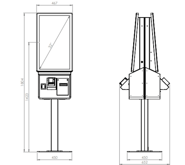 - A technical drawing of the Prestop kiosk on a stand. The front view reveals a tall rectangular screen and a base with controls, while the side view showcases an award-winning box-like structure on a pole, dimensions marked: height 1804 mm and width 467 mm.