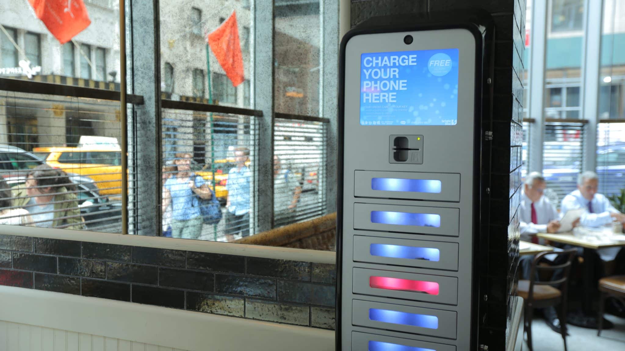 - Street scene showcasing a LinkNYC Wi-Fi kiosk displaying an ad for NYC Restaurant Week. Sue and another person stroll by under the sunny sky, with light traffic passing. Buildings and trees elegantly frame the corner of E 83rd Street.