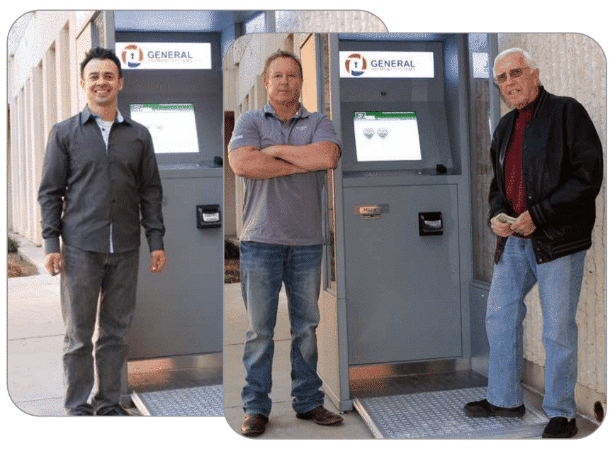 - Three men stand outside, each in front of a grey kiosk labeled GENERAL. The first man is smiling, the second has arms crossed, and the third, holding something in his hand—perhaps a bill payment receipt—completes the scene in their casual attire.