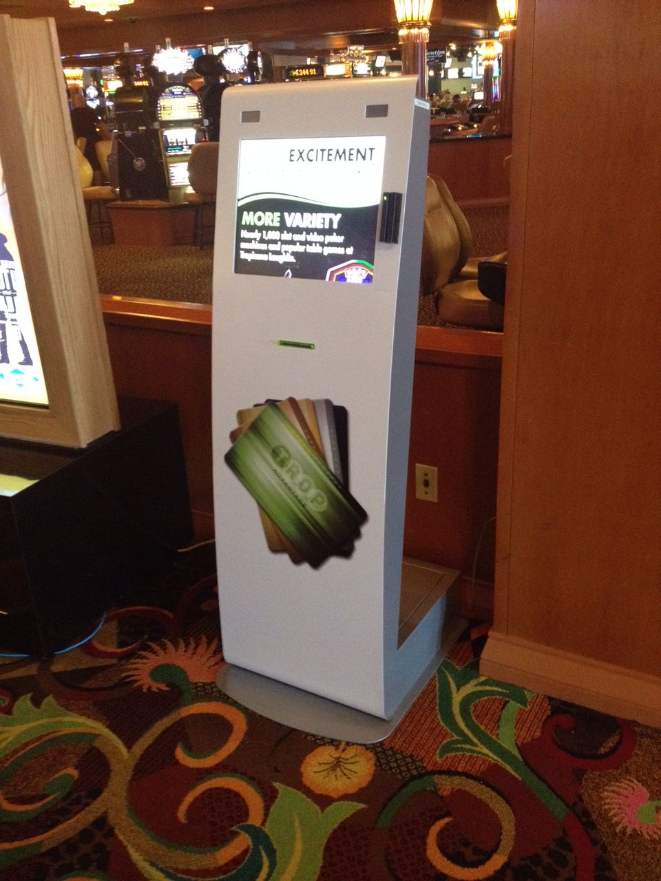 - A white gaming kiosk with a digital screen stands beside slot machines in a casino. It displays details about a blood drive and rewards card. The floor showcases a colorful, floral carpet pattern, adding vibrancy to the lively atmosphere.