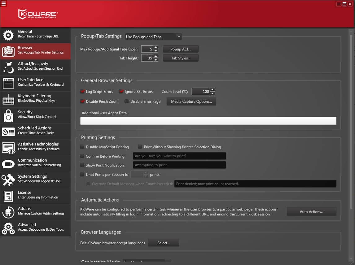 - Screenshot of a kiosk software settings page showcasing options like Popup/Tab Settings, General Browser Settings, Printing Settings, and Automatic Actions. The interface features a red and gray color scheme with checkboxes and dropdown menus for seamless configuration.