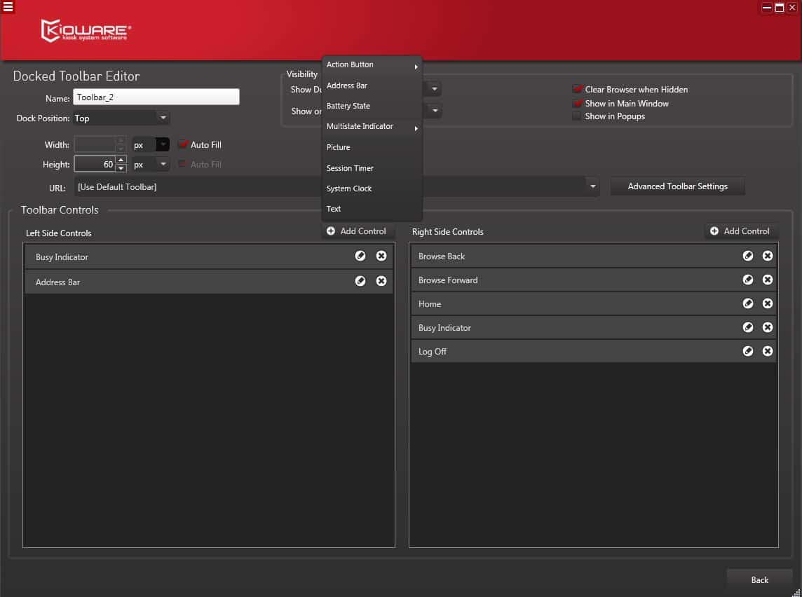 - Screenshot of the KioWare Docked Toolbar Editor interface, a powerful kiosk software tool. It displays options to customize toolbar settings, including visibility, orientation, and controls for functionalities like browsing forward and back, home, and log off.