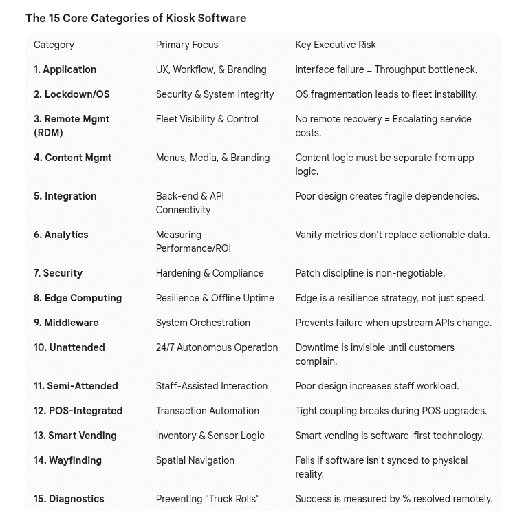 Kiosk software is not a single product category. It is an ecosystem of interdependent software components that together determine whether a deployment can scale from pilot to enterprise infrastructure.