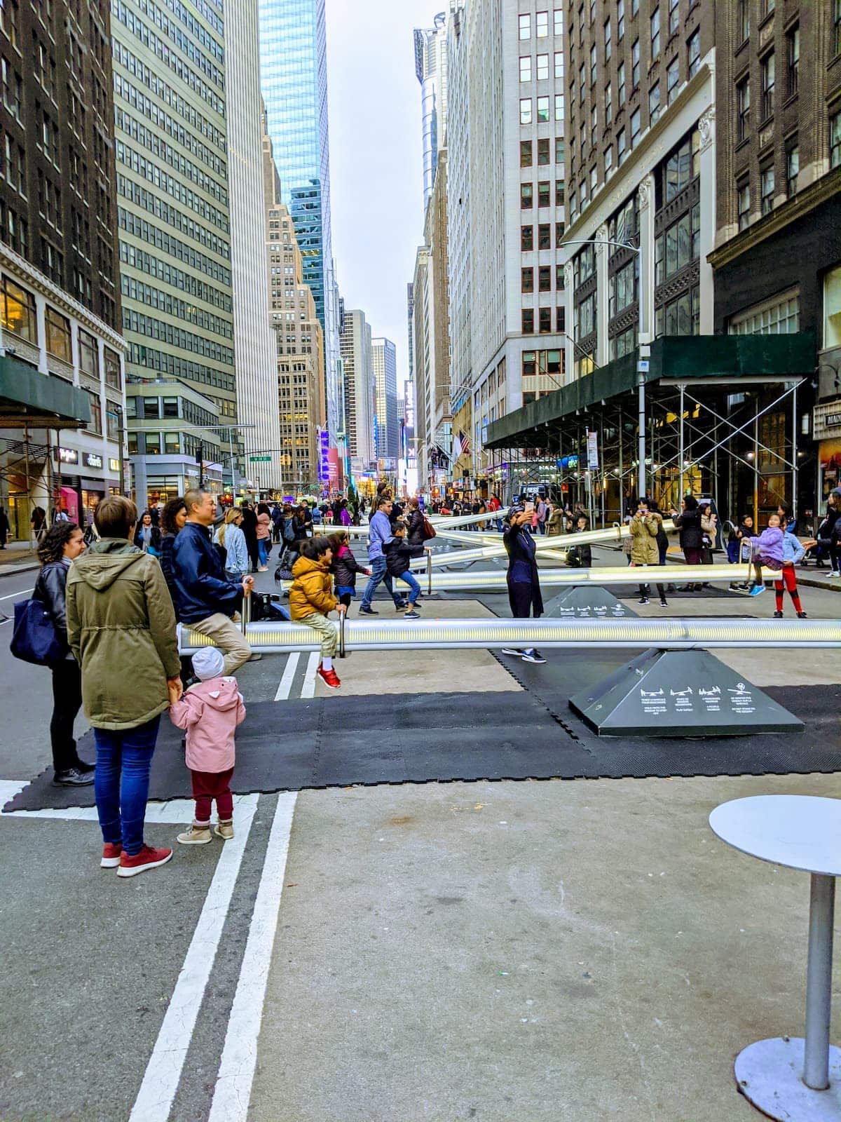 - A bustling city street features people enjoying a row of interactive seesaws, reminiscent of art installations seen at Kiosk NRF 2020. Adults and children play, while others watch. Tall buildings line the street, creating an urban atmosphere. The scene is vibrant and lively.