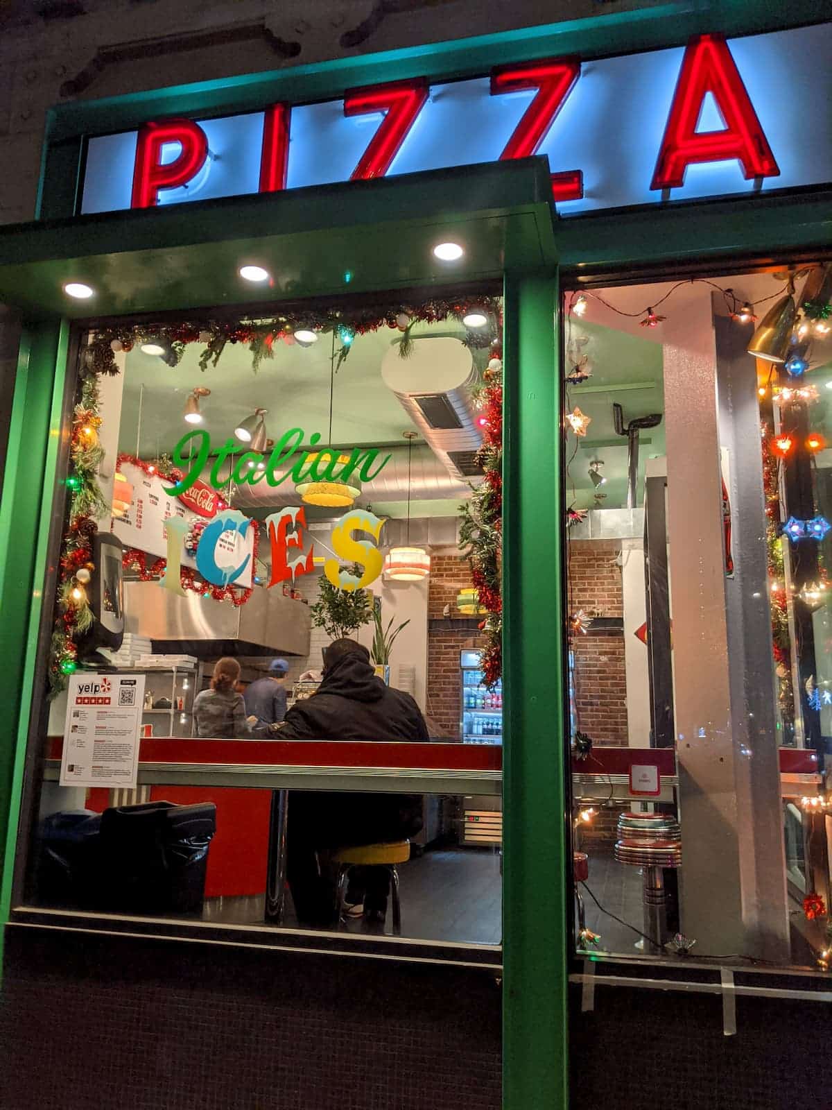 - Street view of a pizzeria with a neon PIZZA sign. The window, reminiscent of NRF 2020 kiosks, is adorned with festive lights and the words Italian Ices. Inside, a few people are seated with a clear view of the counter and kitchen area.