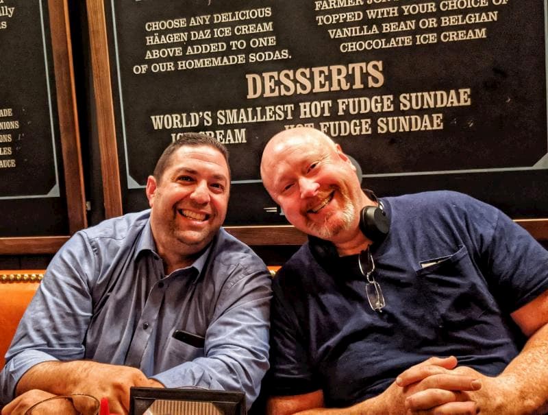 - Two smiling men are seated at a restaurant table with dessert menu signs and an NRF 2020 poster on the wall behind them. One wears a blue shirt, while the other sports a navy shirt and headphones around his neck. They appear relaxed, enjoying their time together near a kiosk.
