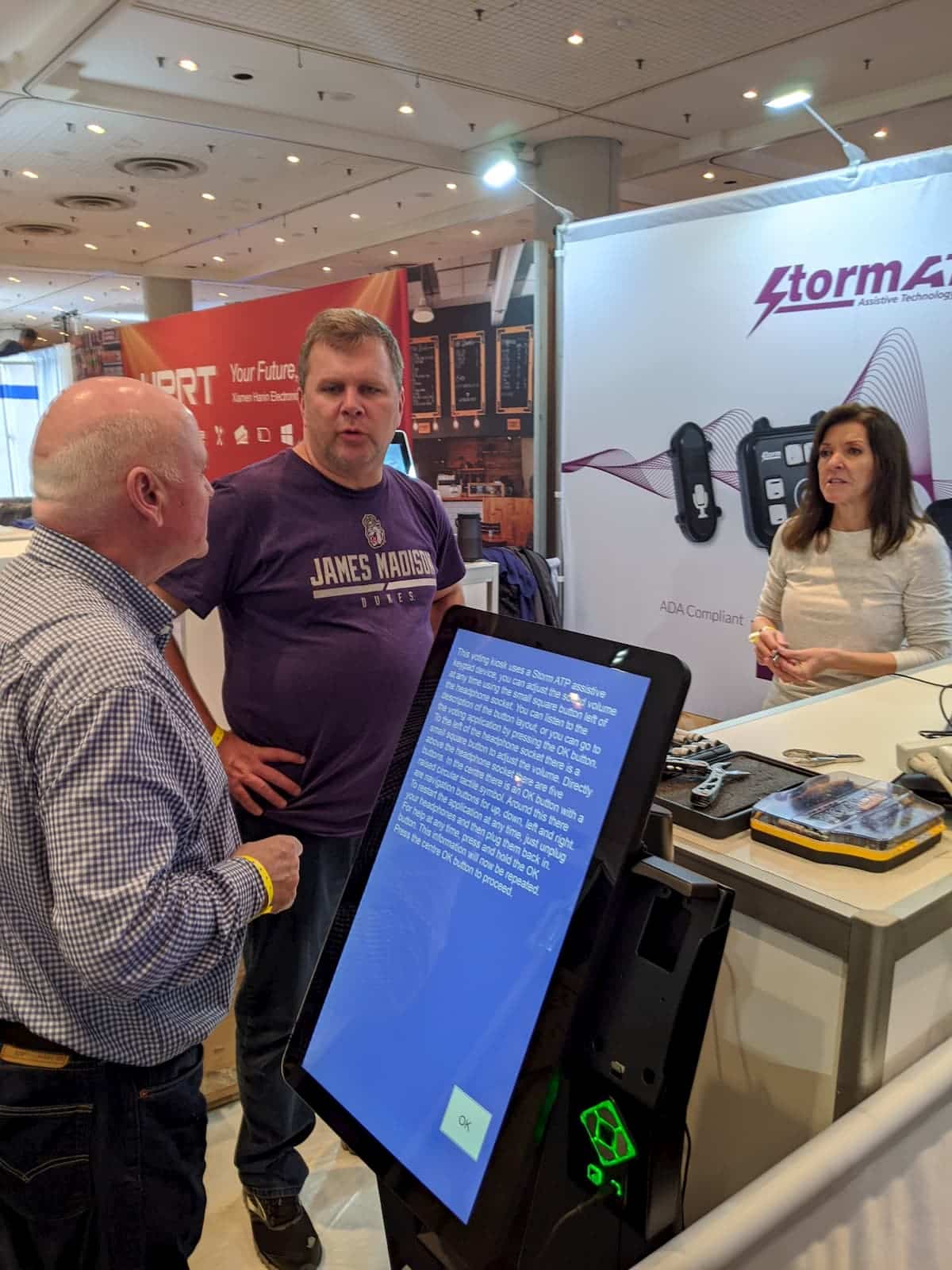 - Three people gather at a technology booth featuring ADA-compliant devices. At the forefront, a touchscreen display shows text. Nearby, a man in a purple shirt converses with another in plaid while a woman stands behind the counter, reminiscent of innovations showcased at Kiosk NRF 2020.