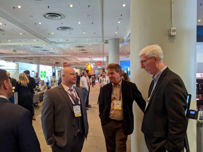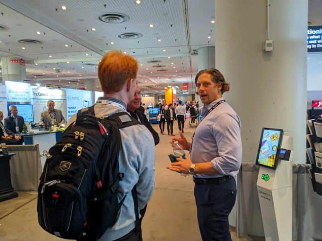 - Three people are engaged in conversation at a bustling trade show, resembling the intense energy of NRF 2020. One person holds a device, while the others carry backpacks. Booths and kiosks buzz with activity in the background.