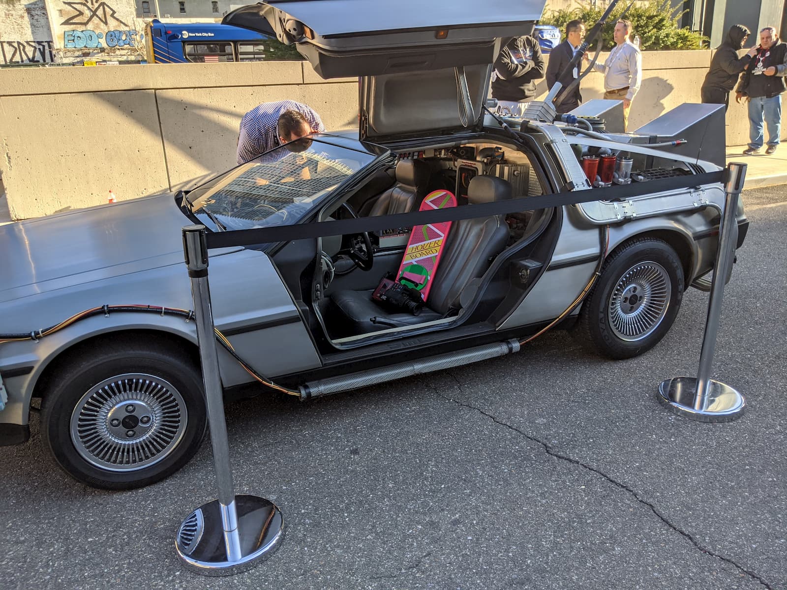 - A DeLorean car with its gull-wing door open is displayed behind black stanchions at the Kiosk NRF 2020. Inside, a futuristic hoverboard is visible on the seat. People stand nearby, some observing the car.